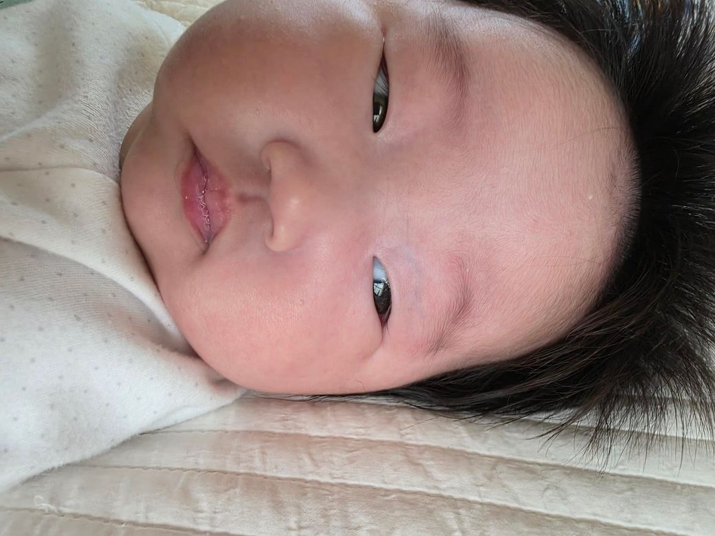 본론으로 넘어가서, 사진상 한쪽 눈두덩이에 국소적인 보랏빛 변색이 보입니다. 외상 후 피하출혈(멍) 가능성이 가장 흔합니다. 73일 영아에서 통증 반응이 없고 부종이 심하지 않다면 경미한 타박에 의한 단순 멍일 가능성이 높습니다.
