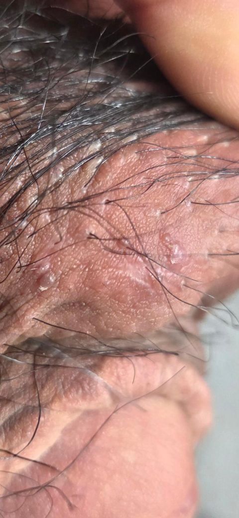 털이 있는 부위이고, 병변이 모공을 중심으로 작은 구진이나 수포처럼 보이는 점에서 모낭염 가능성이 더 높습니다. 면도, 마찰, 땀, 습한 환경에서도 흔히 생길 수 있으며, 통증이나 가려움이 경미하거나 거의 없을 수도 있습니다.