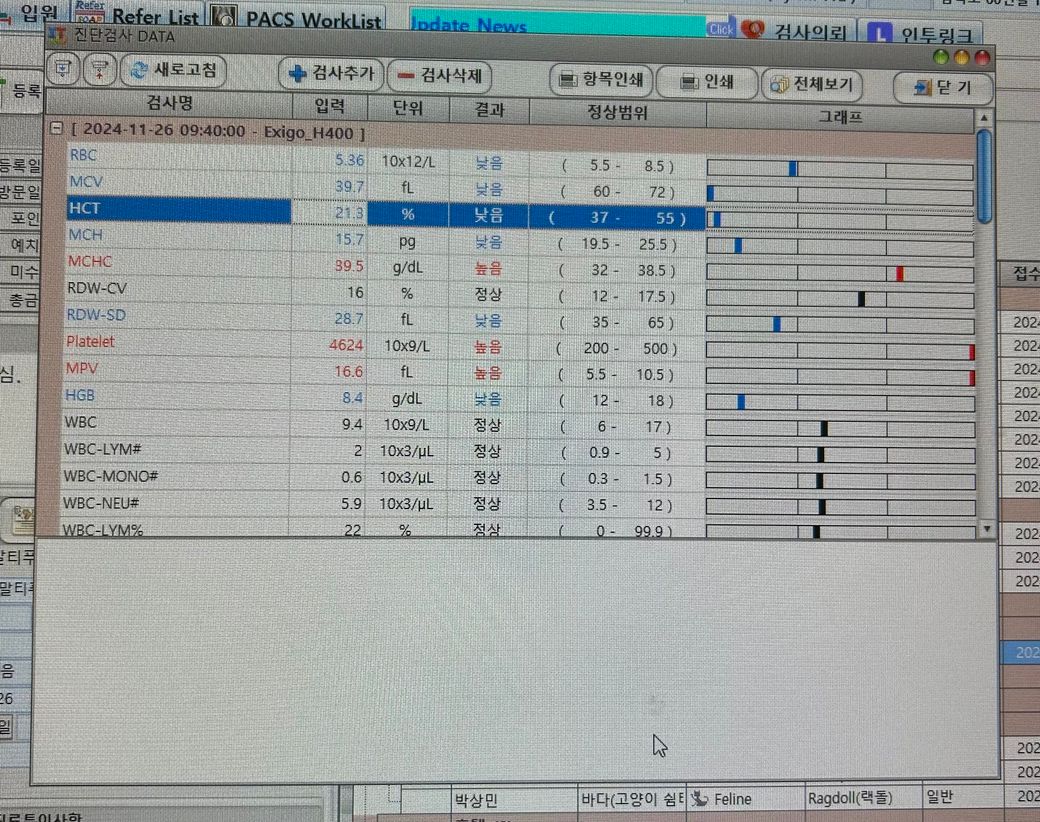 종합적인 스크리닝 진단검사와 CT 검사등 고비용의 검사가 필요한 혈액검사 결과지입니다. CT촬영 가능한 동물병원에 가셔서 재검 받으시기 바랍니다.