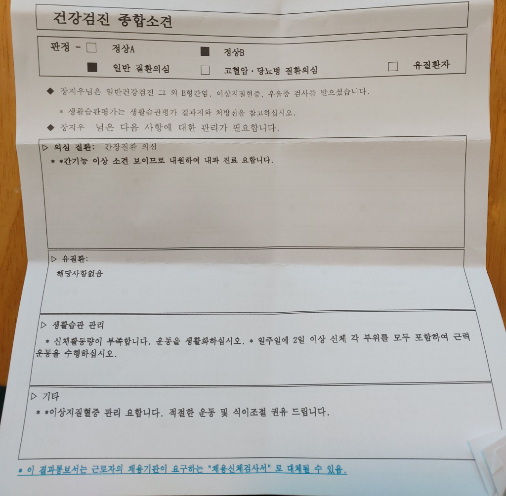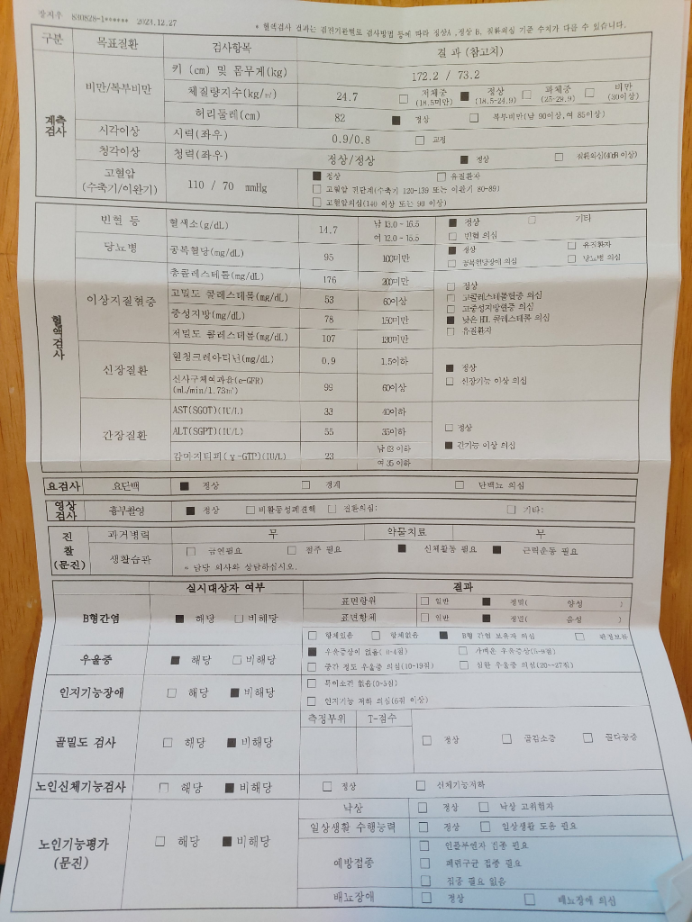 전반적인 결과는 이상 없으나 고밀도콜레스테롤(HDL)이 낮습니다. 이는 심뇌혈관질환의 위험인자가 되므로 금연과 기름진 식이를 피하고 규칙적인 운동이 필요합니다.