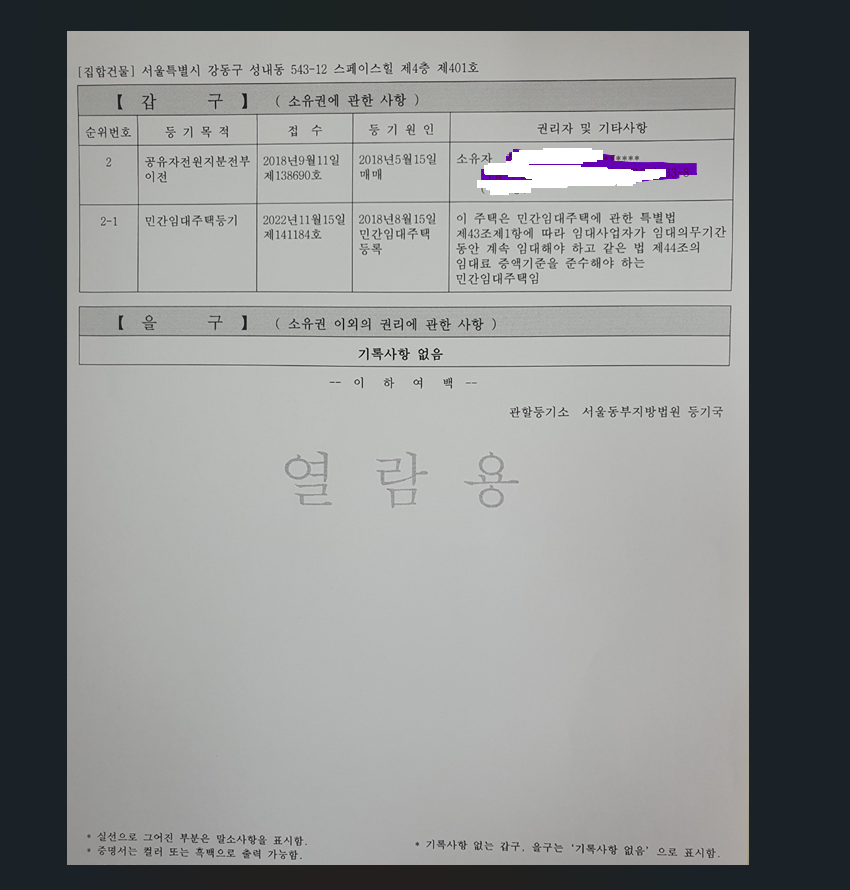 6. 을구에 근저당이나 전세권 등 특이사항은 없습니다.