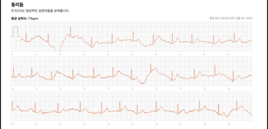 워치의 심전도는 정확도가 떨어지므로 참고만 하실 것을 권하며 올려주신 사진의 경우 기준선이 많이 흔들려 있기 때문에 판독에 적합하지 않습니다.