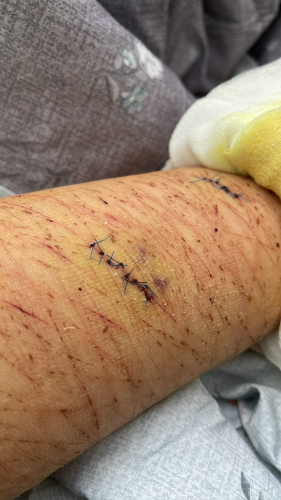 7바늘, 6바늘 꿰맨 상처로 보입니다. 자해 등 관련하여 생긴 상처로 보이는데, 의사 외 일반인들이 보실 때에는 다른 긁힌 상처 등과 구분이 힘들 수 있습니다.