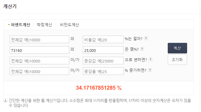 73160×(x/100)=25000 을 기본식으로 하고 X를 구하기위해 풀어주면 결국 2500000/73160이 X가 됩니다.