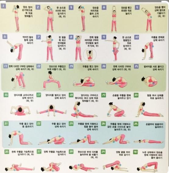 스트레칭의경우 처음부터 격한동작을 하기보다는 약한강도로 천천히 시작하는것이 좋은데요 유튜브를참고해 따라한다면 좀더 쉽게동작을 배울수있고 몸의 전체적인 부분을 충분히 해주는것이 좋습니다