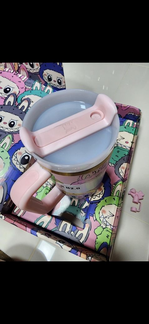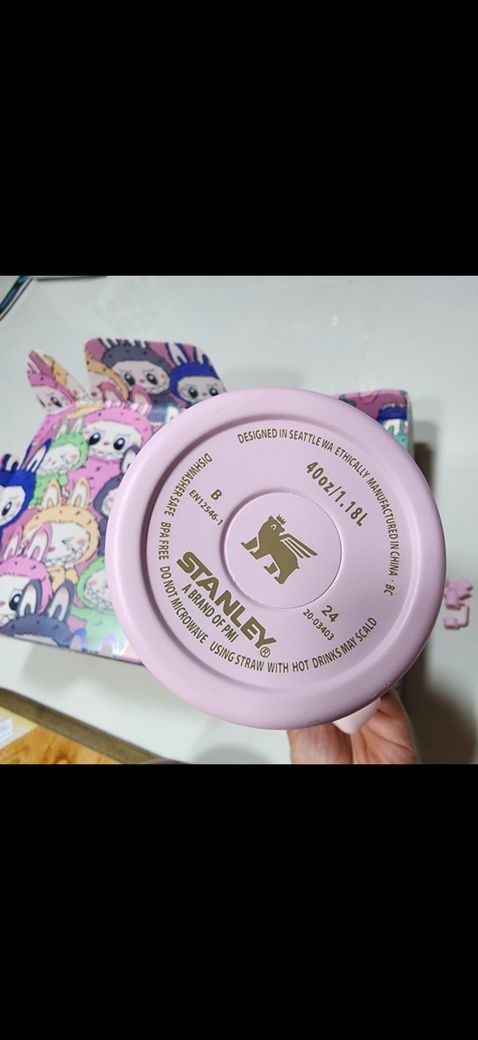 스탠리 정품은 보통 박스 하단에 시리얼 넘버와 정품 홀로그램 스티커가 붙어 있고, 마감도 깔끔한 편입니다. 이미지상 외관은 정품처럼 보이지만, 콜라보 제품일수록 가품이 많으니 공식 홈페이지나 정식 판매처와 비교해보시는 게 가장 확실합니다. 가품일 경우 내부 프린트 퀄리티나 마개 고정감도 다를 수 있어요.