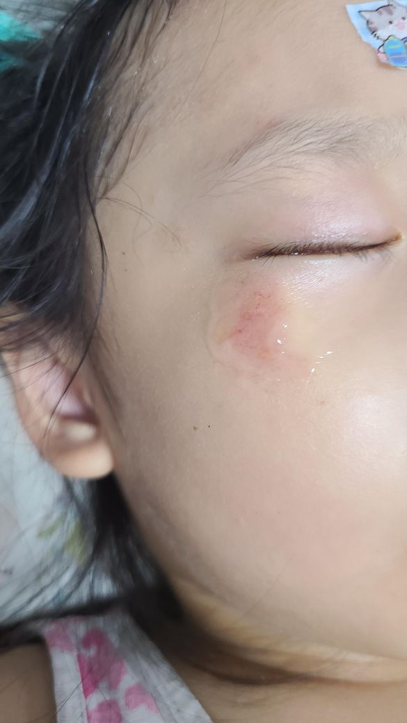 5살 아이가 아이 자동차에서 떨어져 얼굴을 쓸렸어요
