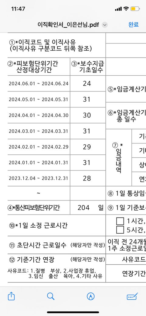 일하던 직장은 계약만료로 그만두게 되었는데 이 문제로 이직확인서를 보내달라 하니 받은 확인서에는 204일이라 적혀있고요 이 서류를 가지고 근로복지공단에 가서 물어보라고 하고 끝이더라구요