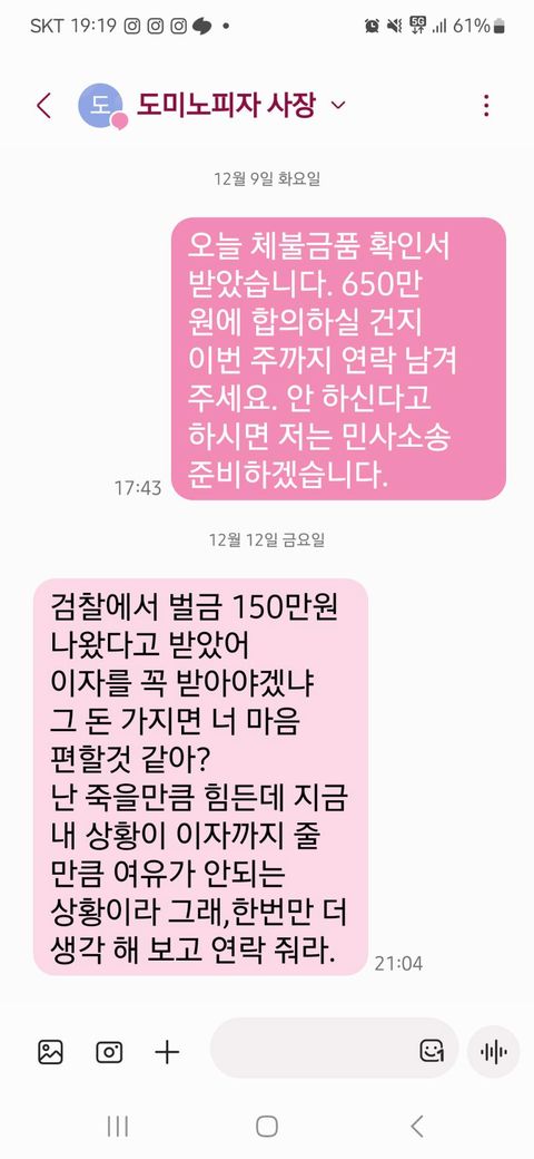 그래서 제가 650만원이 제 마지막 합의의사라고 했더니 자꾸 저렇게만 말하네요. 어떻게 하는 게 좋을 지 의견들 남겨주시면 안될까요...?