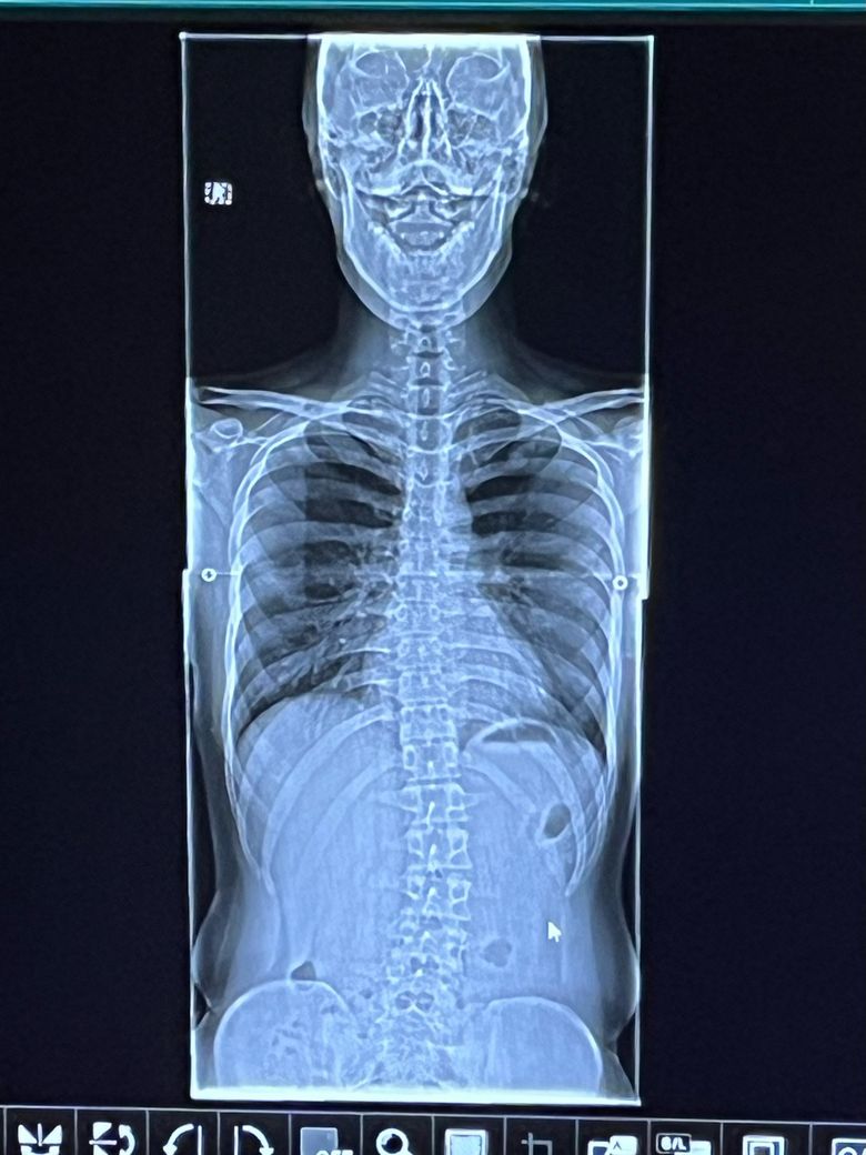x-ray로 보았을 때는 척추측만증과 골반 틀어짐 등 신체 불균형이 있는 것으로 보입니다.