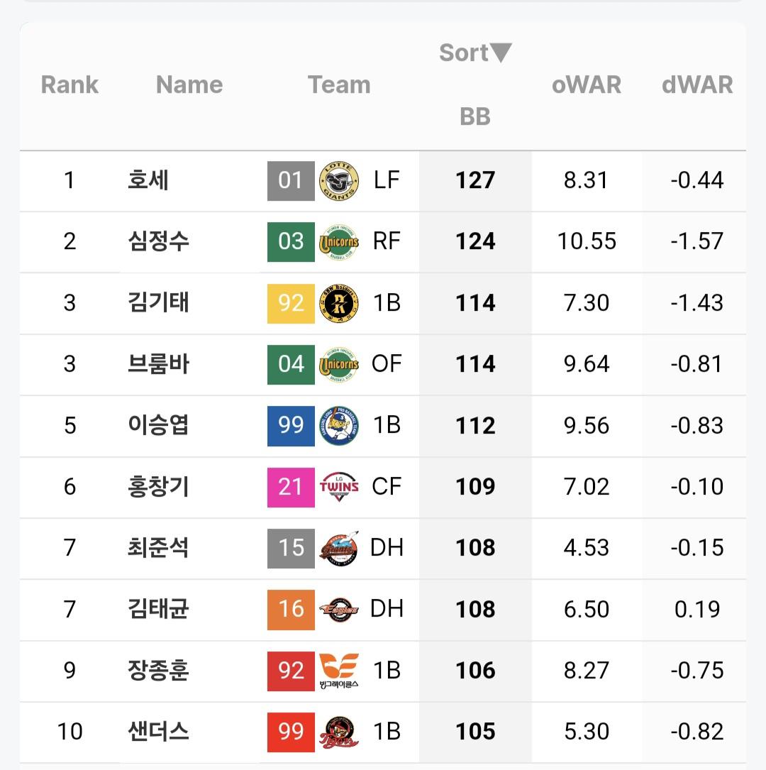단일시즌 최다 볼넷 순위가 어떻게 되는지 궁금한 것 같습니다.