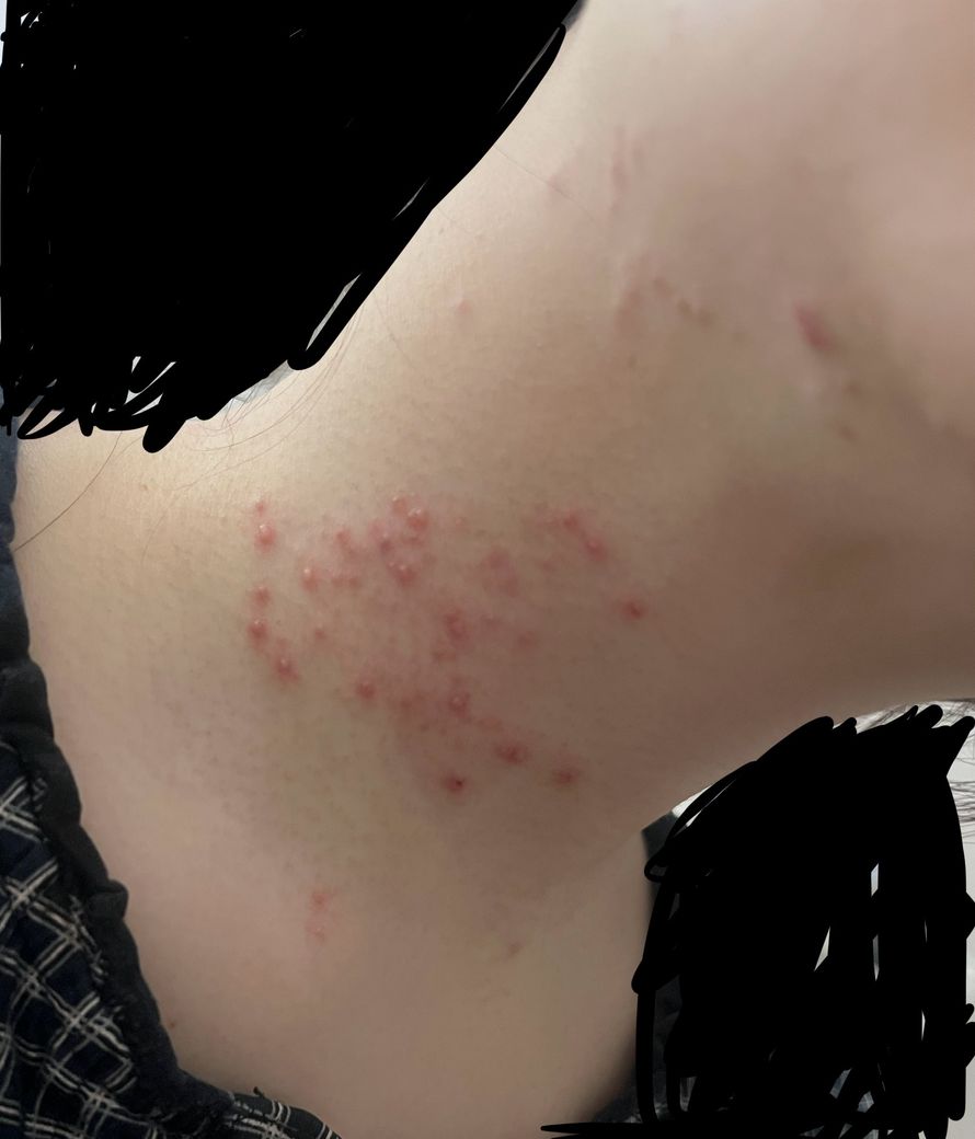 수포처럼 보이는 병변이 있어 대상포진이나 단순포진일 가능성도 배제할 수 없습니다.