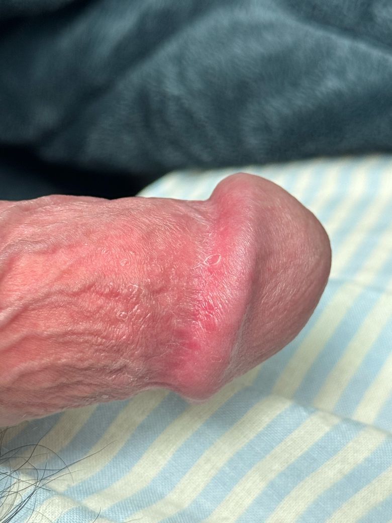 오늘 아침부터 간지러워서 보니까 귀두 밑에 붉은 반점이 있어서 궁금해서 말씀드려요 귀두 기준 왼쪽만 간지럽고 붉은 반점이고 보시다시피 오른쪽은 아무렇지 않습니다 성관계는 하루 전과 이틀 전 5일전 있었습니다
