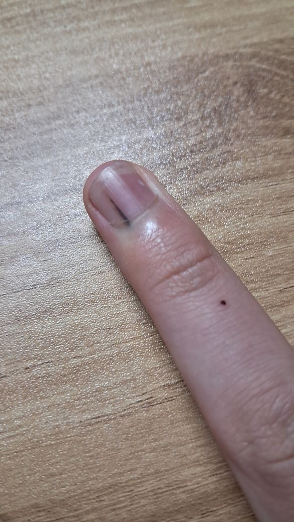 며칠 전에 발견하고는 언젠가 지워지겠지 하며 가볍게 넘겼었는데 오늘 다시 손톱을 보니 검은 줄이 있어서 미술 시간에 연필이 손톱에 그어졌나 보다 하고 지우개로 손톱을 문질렀는데 안 지워져서 구글에 검색해보니 흑색종일 수도 있다고 하더라고요 지금 보니 약간 위에 점인지 아니면 딱지인지 조그만 점도 있는데 이게 무슨 증상인가요?