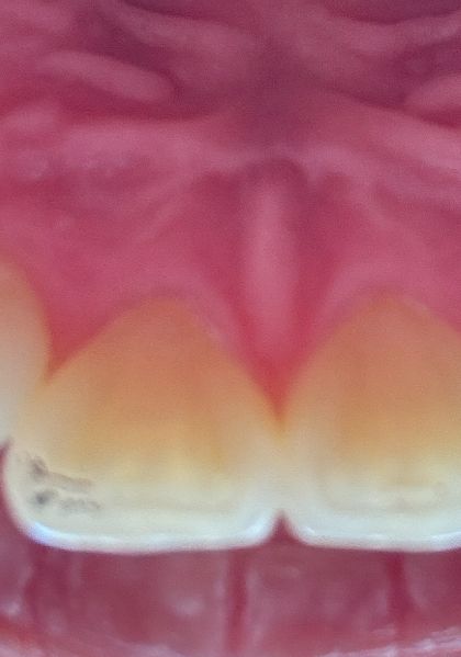 얼마전 오돌뼈를 앞니로 잘못씹은후 앞니에 계속 통증이 있어 병원에 다녀왔는데 엑스레이상 별 문제가 없었습니다 또한 밑에 이와 닿을때마다 밀리는느낌이 있어 교합도 봐달라했는데 이정도면 조정은 안해도될것같다 하시는데 저는 무리하게 닿는것 같아서요ㅜㅜ 교합점으로 한번 봐주실수있나요 첫번째사진이 앞니 안쪽부분 두번째사진이 밑에 앞니옆이빨 사진입니다. 교합점이 앞니에서 저렇게 찍히는게 정상인가요?
