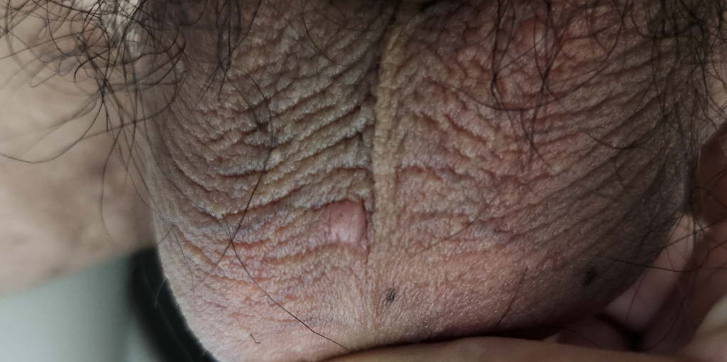 사진상으로 명확한 판별은 어렵지만 곤지름이라고 하는 콘딜로마의 가능성이 있습니다. 곤지름은 인유두종바이러스 (HPV)에 의해서 발생하며 일반적으로 단일 혹은 무리를 이루어 발생하는 부드럽고 매끈하거나 융기된 구진이나 반점같은 병변이 항문과 성기 부위에 나타나는 경우 의심할 수 있습니다. 하지만 시진으로만 감별이 어려울 수 있어 조직검사등이 필요할 수도 있습니다.