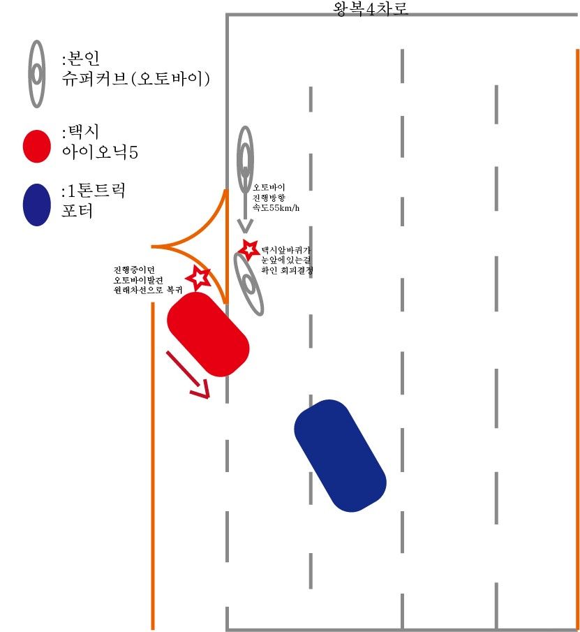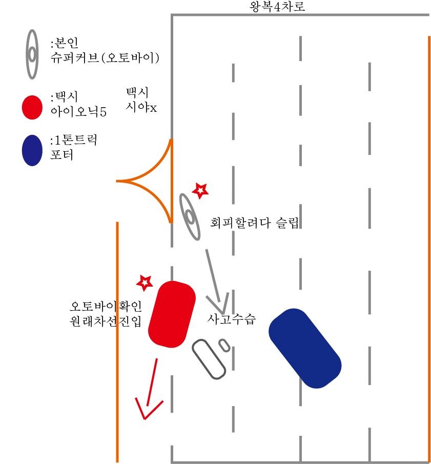 슬립이 되는시점에 택시는 다시 원래차선으로 돌아갔고 저는 쓰러진 오토바이를 수숩하고 택시를 찾았는데