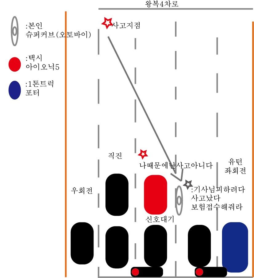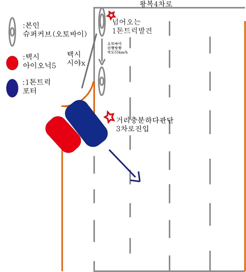 본인: 트럭은 지나가는거 확인했고 뒤이어 택시가 직진하고 있는 내차선에 들어와서 피할려다가 넘어졌다!