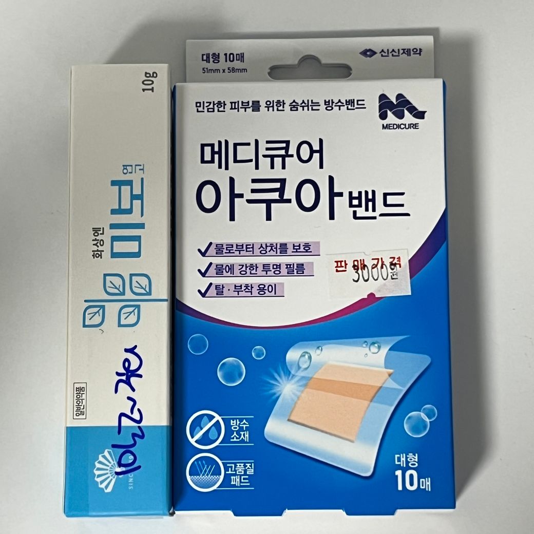 omfeel Plus Transparent 라는 드레싱밴드랑 미보연고를 처방 받았는데요. 직접 드레싱을 하는건 처음이라서요. 일단 식염수로 소독을 한 후 연고를 바른 다음에 드레싱밴드를 붙였는데, 이렇게 하는게 맞나요? 드레싱 교체주기랑 해당 제품이 자외선 차단기능이 있는지도 궁금합니다. 그리고 물 닿는 일을 할 땐 드레싱밴드 대신 방수밴드를 붙여도 되나요?