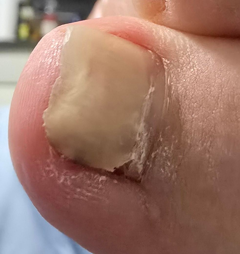 사진의 소견만 놓고 구체적인 감별 진단까지 내리는 것은 가능하지 않습니다. 발톱의 무좀 등 문제에 의해서 유발될 수 있는 소견에 해당하기는 하겠으며 관련하여서는 일단 구체적인 진단을 받은 뒤에 치료 방향을 결정하는 것이 필요하므로 피부과적으로 진료 및 검사를 받아보시는 것을 권고드립니다.