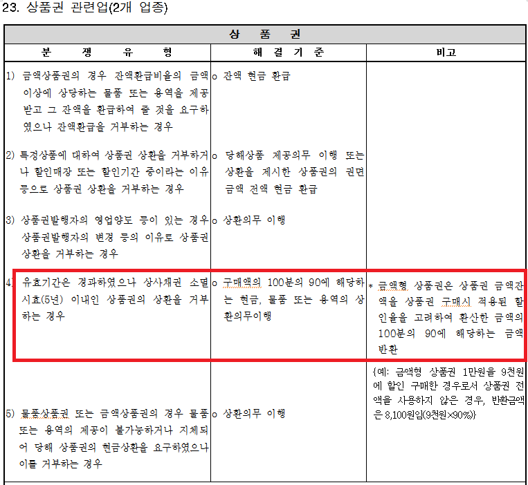 다만 유효기간이 경과하였으나, 5년의 상사시효는 도과하지 않은 경우와 관련하여 공정거래위원회고시인 "소비자분쟁해결기준"은 아래와 같이 90% 상당을 돌려 줄 것을 규정하고 있습니다.