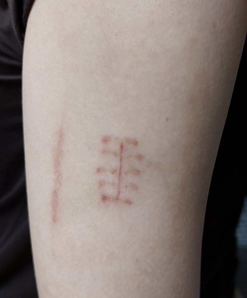 상처는 깨끗하게 아물었습니다. 염증이 보이지 않으므로 지금의 통증은 수술하며 손상된 피부의 신경들이 회복하는 과정에 나타난 증상이라 예상됩니다. 진통제 복용하며 기다려보시기를 권해드립니다.