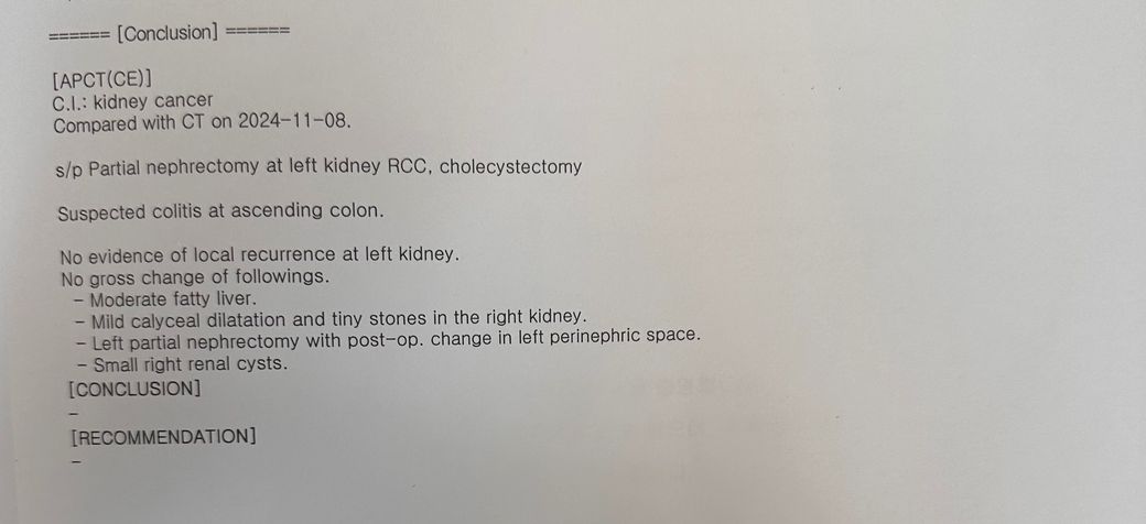 신장암 추적검사 복부 ct 결과인데요. 대장염이 있다