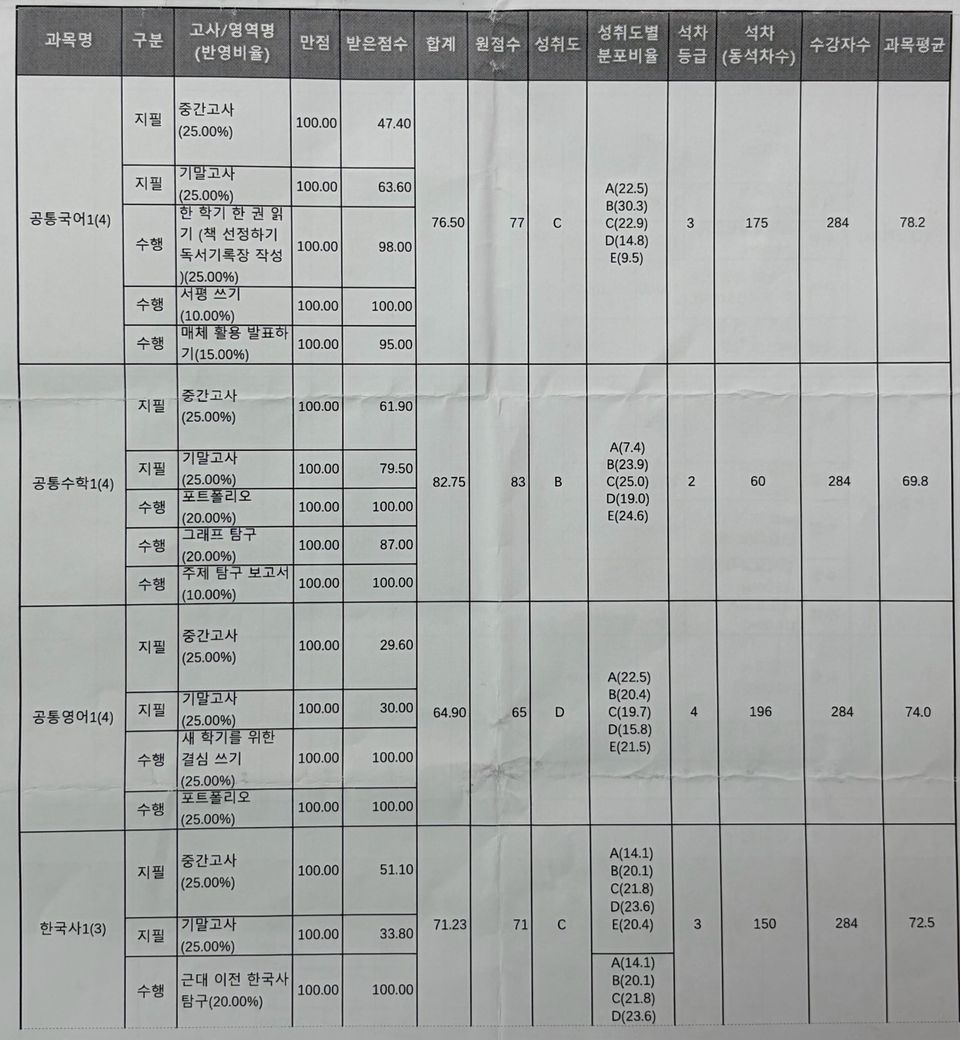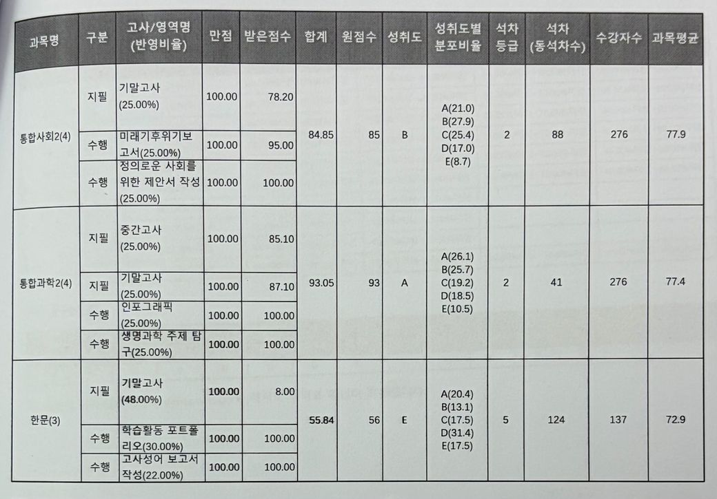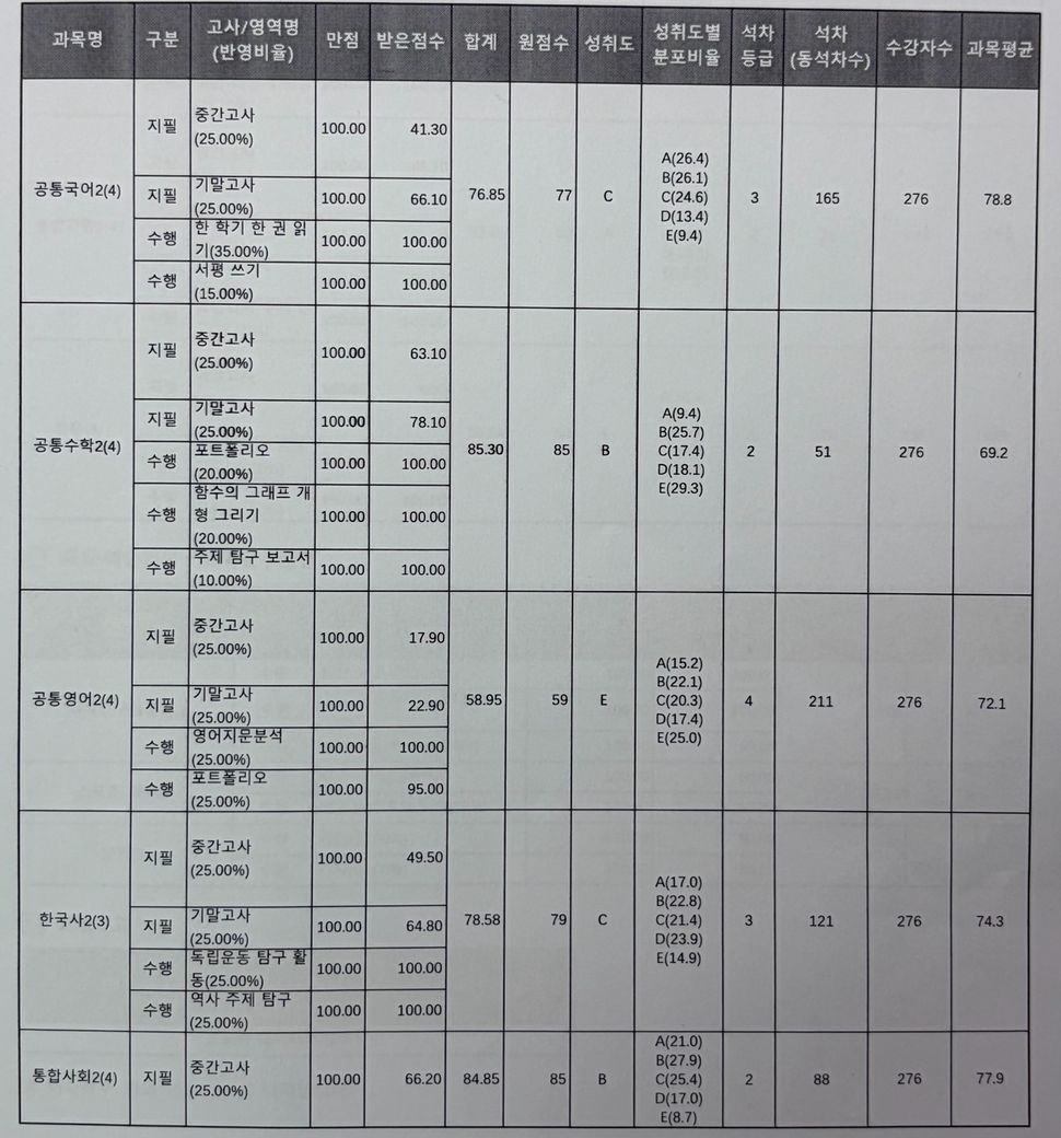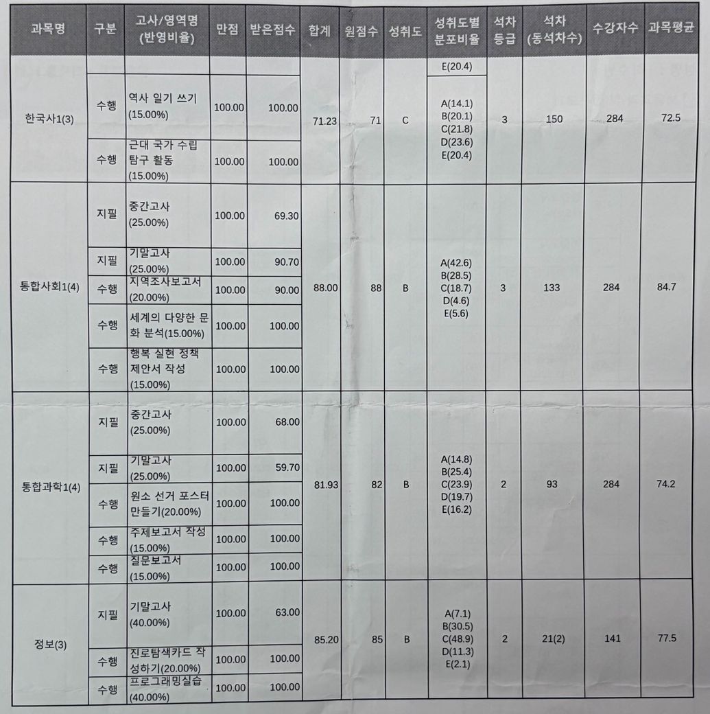 1학기-국어3 수학2 영어4 사회 3 과학 2 한국사 3 정보 2