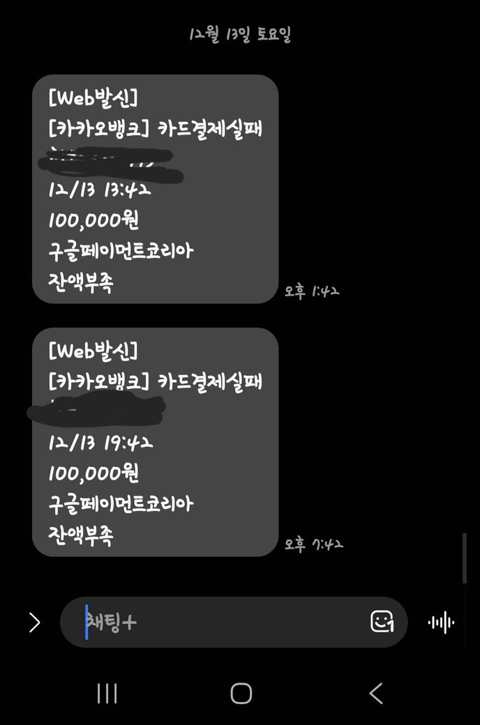 카뱅 결재한적도 없는데 자꾸 결재 실패문자가 와요