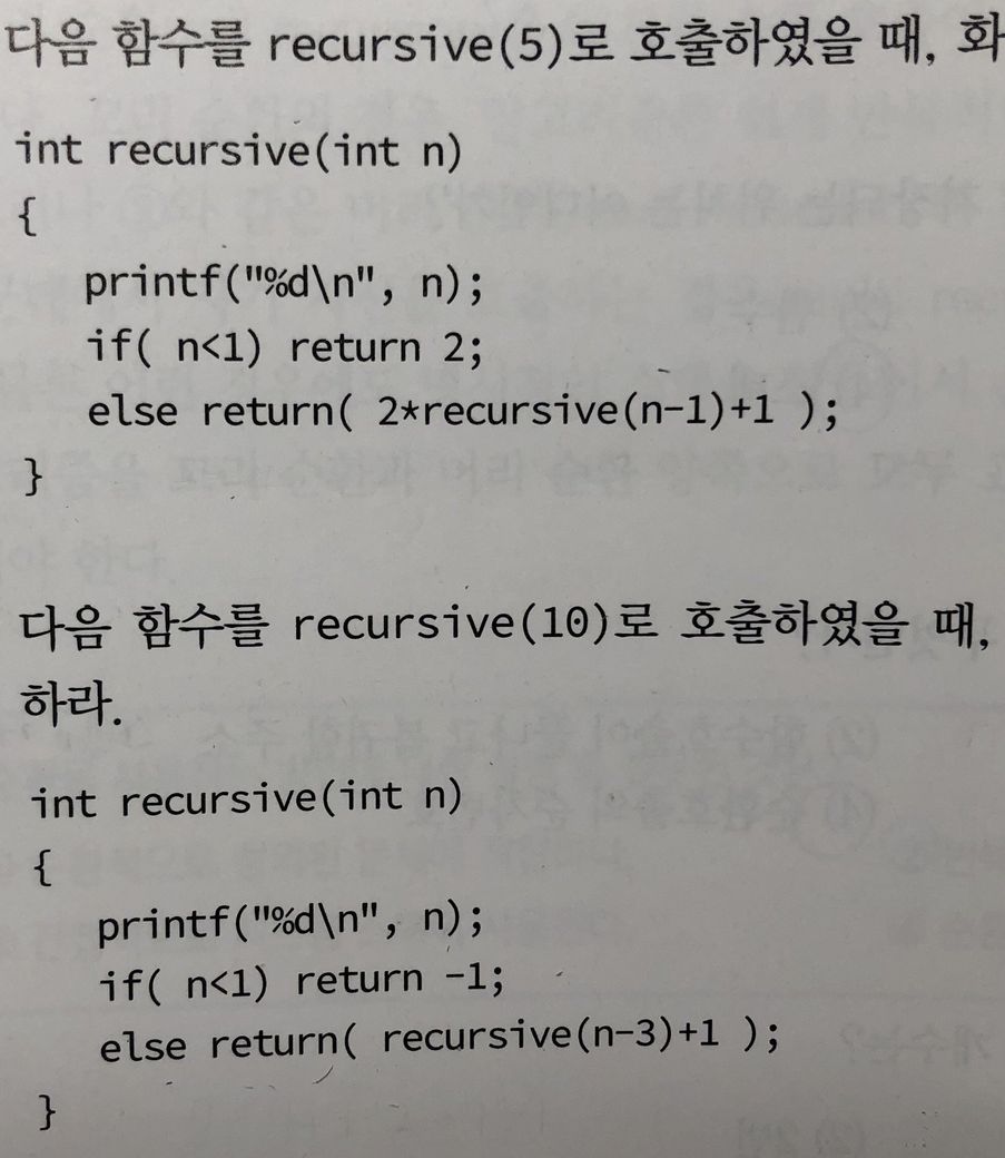 printf("%d\n, 5); //5가 화면에 출력 if(5<1) return 2; //false니까 실행안됨 else 실행 else return(2*recursive(4)+1);그러면 '2*recursive(4)+1'가 반환 될 겁니다.