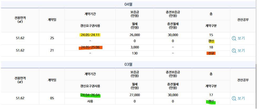 오렌지색 24.05-25.06 의 경우는 신규 월세계약으로 보이는데