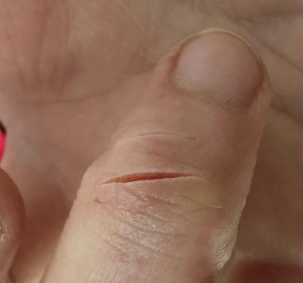 사진상 손가락 주름 부위에 비교적 얕아 보이지만 벌어짐이 있는 열상입니다. 이 부위는 움직임이 많아 상처가 쉽게 다시 벌어지고 지혈이 반복적으로 깨질 수 있습니다.