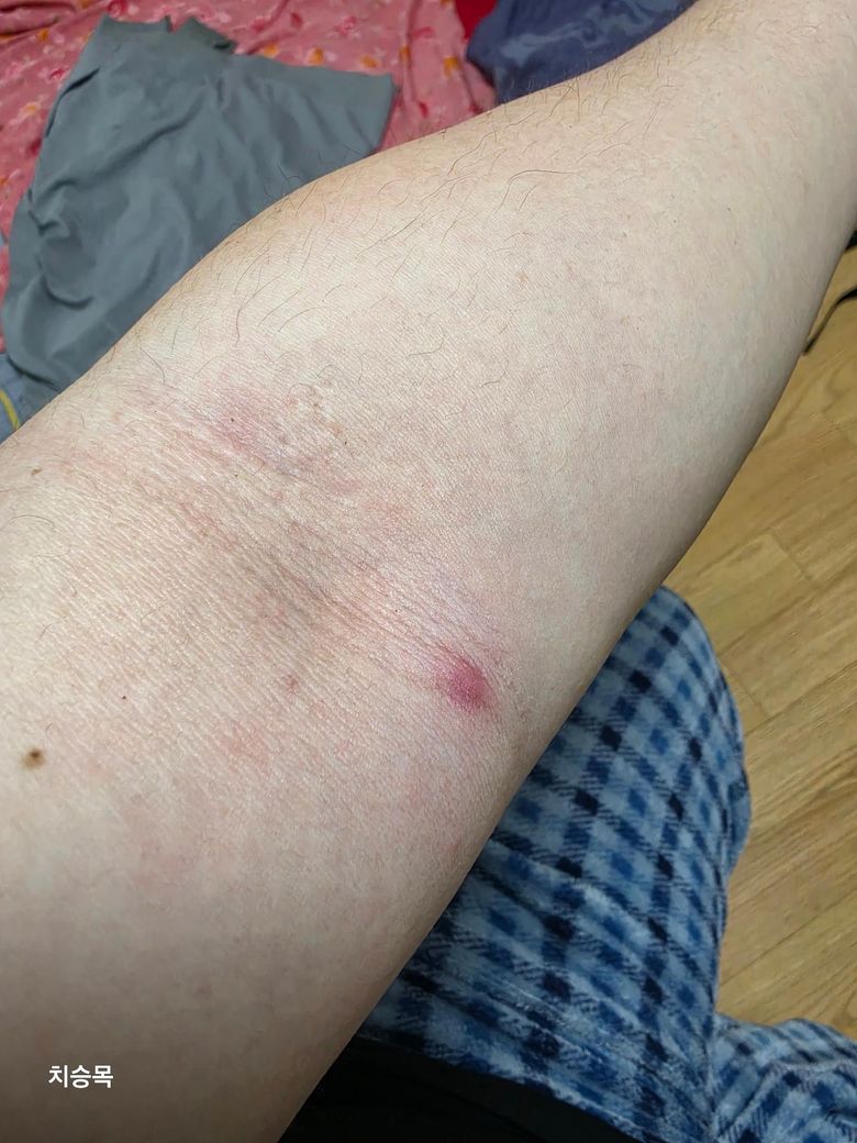 사진상 팔오금 부위에 국소적으로 붉게 솟은 결절이 보이고, 눌렀을 때 통증과 약간의 열감이 있다는 점을 고려하면 단순 피부 자극보다는 모낭염 또는 초기 종기와 같은 국소 세균 감염 가능성이 가장 높습니다. 털이 있는 부위에서 흔히 발생하며, 초기에는 작은 붉은 결절 형태로 시작해 진행 시 중심부에 고름이 형성될 수 있습니다.