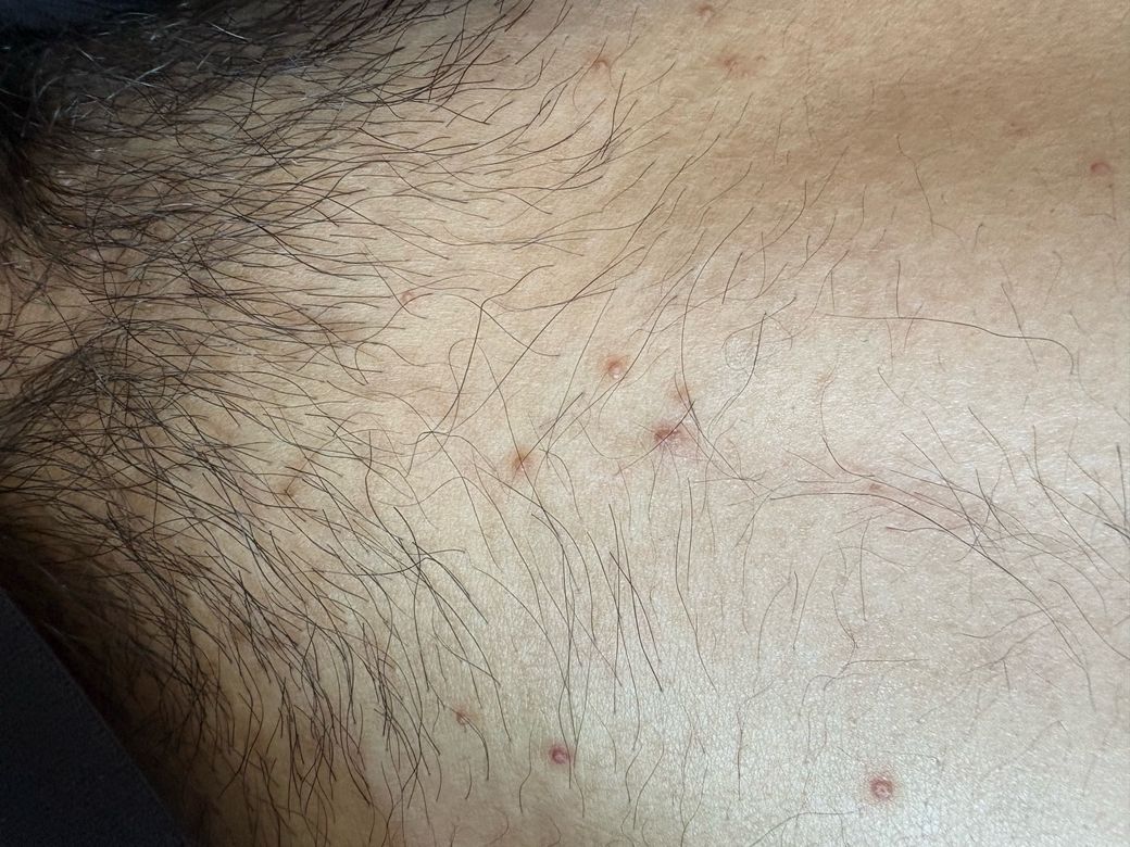 가장 가능성 높은 것은 모낭염입니다. 면도, 마찰, 땀, 위생 상태 변화 등으로 모낭에 세균 감염이 생기면서 이런 형태로 나타납니다. 특히 성기 주변 털이 있는 부위에서 흔합니다. 임상적으로는 통증 없이 작은 붉은 구진 또는 농포 형태로 시작하는 경우가 많습니다.