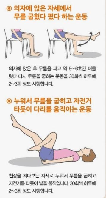 우선 현재로썬 누워서라도 다리 들기, 하늘 자전거, 무릎 밑에 베개 두고 다리를 편 상태로 베개 누르기, 까치발 들기 등 해보시길 바랍니다.