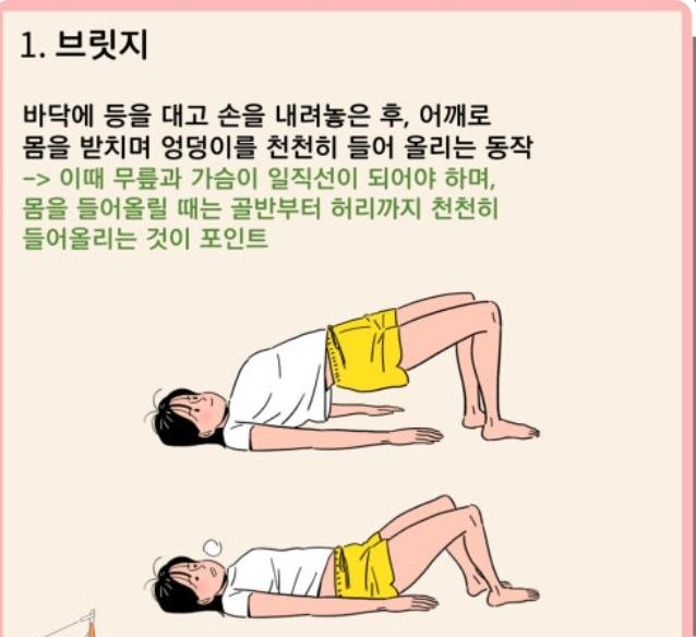기초적인 근력을 위해서는 눕거나 앉아서 할 수 있는 큐세팅과 같은 간단한 근력운동이 있고, 브릿지 운동을 통해서 하체ㅇ와 골반 근육을 강화해보시는 것도 좋겠습니다.