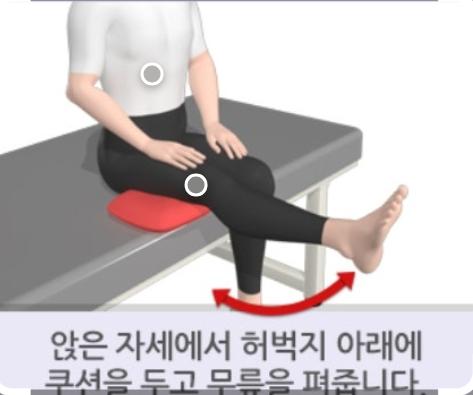 의자에 앉아 무릎 펴기 운동은 가장 기본입니다. 의자에 앉아 한쪽 다리를 천천히 들어 무릎을 완전히 펴고 5초 유지 후 내립니다. 좌우 각각 5회에서 10회. 하루 2회 시행하십시오.