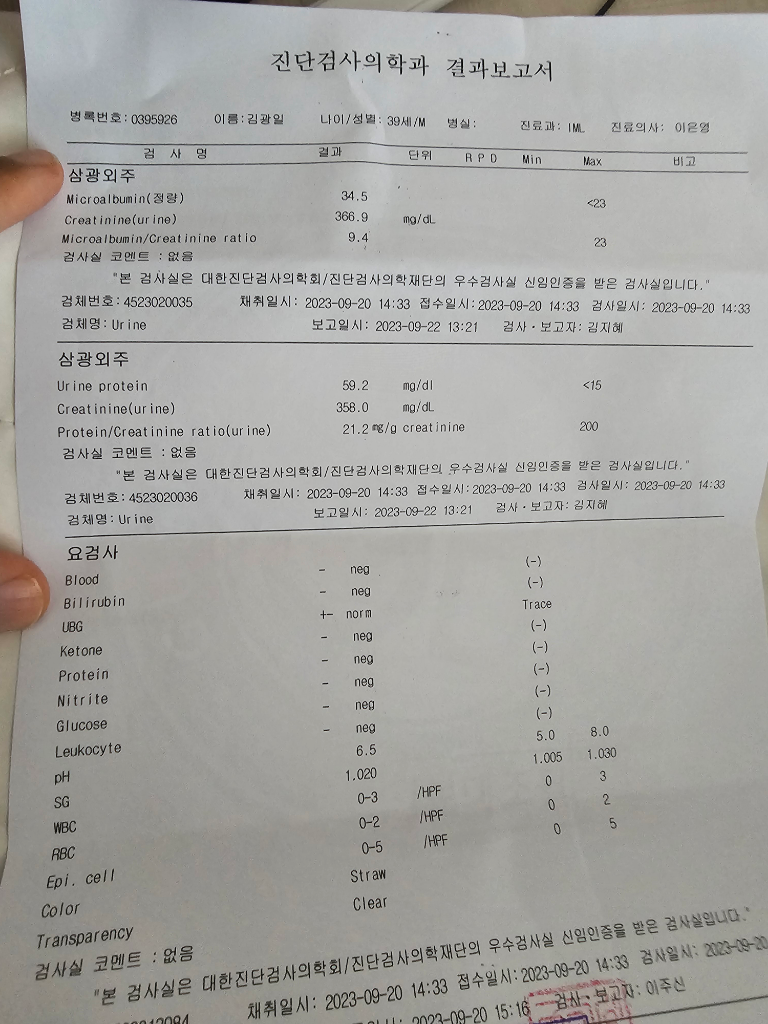 오른쪽 2줄이 정상치입니다. 대부분은 - 로 나와야 정상인 것이지요. 나머지는 수치가 나와있는 것이구요. 결론적으로 미세 알부민이 나오는 상태입니다.