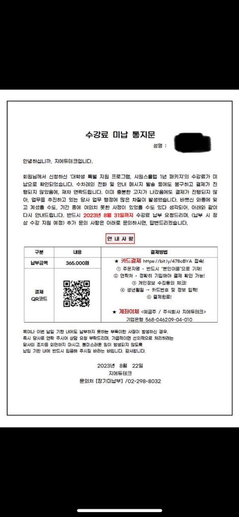 에듀테크 대학생 특별 패키지 선착순으로 90프로 할인해준다고 해서 신청했는데 자세히 알아보니 90프로 할인도 아닌거 같고 선착순도 아닌거같고 강의질도 떨어지고 돈 아까워서 신청하고 8일 지난후에 취소할려고 했더니 이미 신청하고 7일이 지나서 철회가 안된다고 합니다. 그래서 그냥 돈을 안내고 있었는데 문자로 이게 왔습니다 31일까지 돈을 안내면 고소 당하는건가요? 신청하고 7일이 지나면 무조건 철회가 안되는건가요? 이 프로그램 방식이 신청을 하면 교재를 먼저 보내고 계좌에 수강비를 입금하면 코드를 보내 그 코드로 인강을 들을수 있는 방식입니다