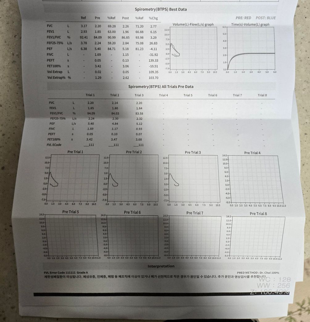현재 검사 기준으로는 제한성 환기 장애에 해당하나 앞서 드린 답변과 같이 불완전한 검사로 검사 결과를 완전히 신뢰할 수 없습니다.