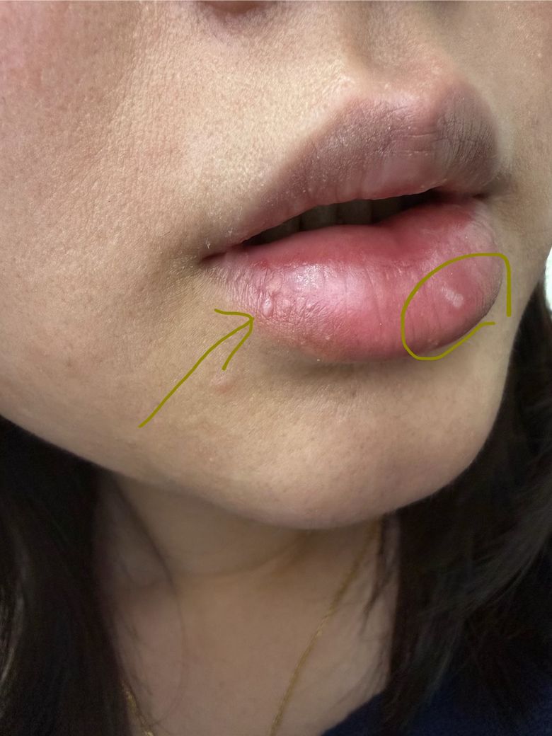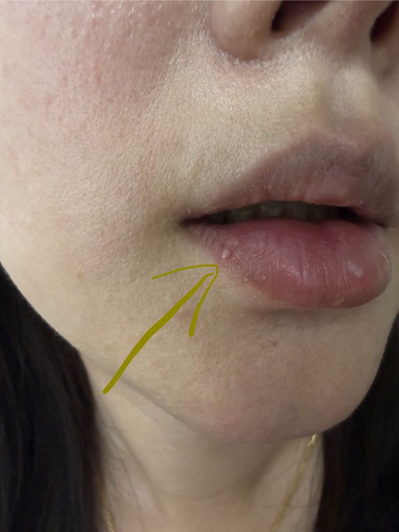 또 다른 가능성으로는 포다이스 반점이 있으나, 이는 피지선이 겉으로 드러난 정상 변이로 대개 오래전부터 존재하거나 서서히 인지되는 경우가 많습니다. 반면 질문처럼 특정 자극 이후 새로 생겼다면 외상성 변화가 더 설명력이 높습니다. 점액낭종은 보통 투명하거나 약간 푸르스름하고 약간 부풀어 오르는 양상을 보여 현재 소견과는 다소 차이가 있습니다. 사마귀의 경우 표면이 거칠고 점점 돌출되는 경향이 뚜렷한데, 현재 형태와는 일치하지 않습니다.