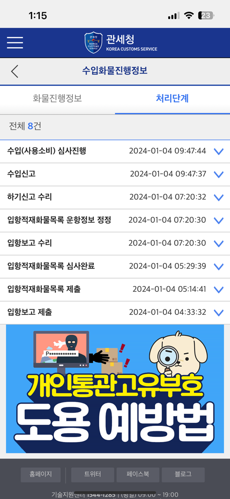 현재 주말인 관계로 통관 진행에 조금 지연이 있을 가능성이 있으며, 큰 문제가 없다면 수일 내에 통관절차가 완료될 것으로 보입니다.
