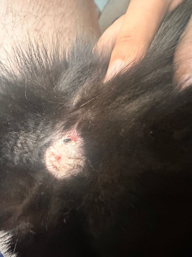 항문낭액이 배출되다 굳은것이거나, 농포가 오래되어 굳은것, 똥이 굳어 붙어 있는것 등의 가능성이 있어 보입니다. 육안으로 확인하고 평가해야 하니 동물병원에 데려가서 진료 받아 보시는걸 권합니다.