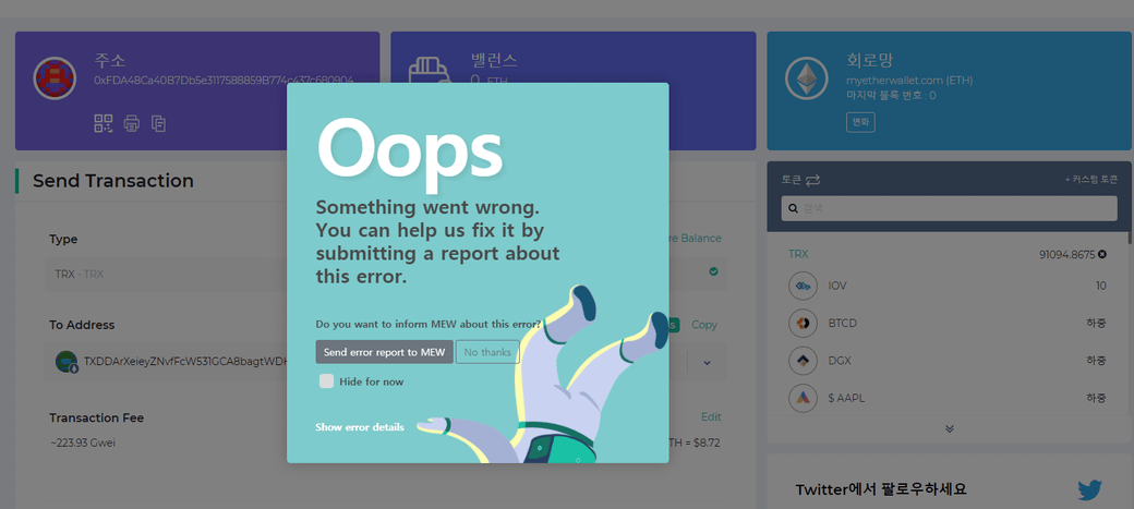 만약 위와 같은 경고를 무시하고 억지로 보내려고 트론을 전송하려고하면
