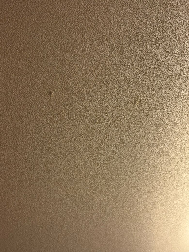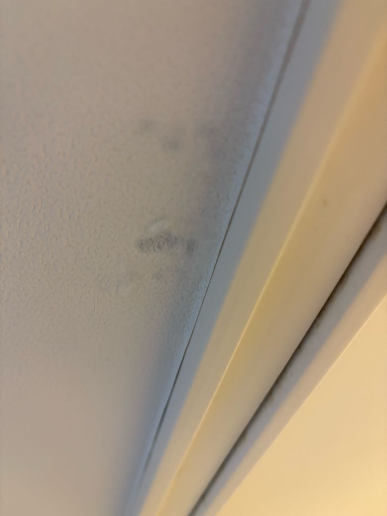 사진으로 보면 곰팡이라기보다는 타카자국(천장 마감핀 자국)가능성이 높습니다. 곰팡이는 대체로 퍼지듯 얼룩이 생기고 색이 회색과 검은빛으로 번지지만, 이건 표면이 볼록하게 올라와 있고 퍼짐이 없습니다. 또한 경계가 뚜렷하고 일정 간격이라 시공 흔적일 확률이 큽니다. 다만 만졌을떄 눅눅하거나 색이 점점 번지면 곰팡이일수 있으니 며칠 후 색 변화 있는지 확인해 보세요