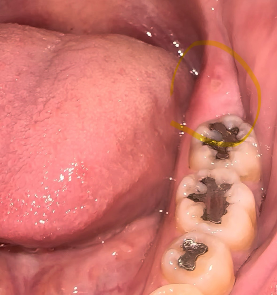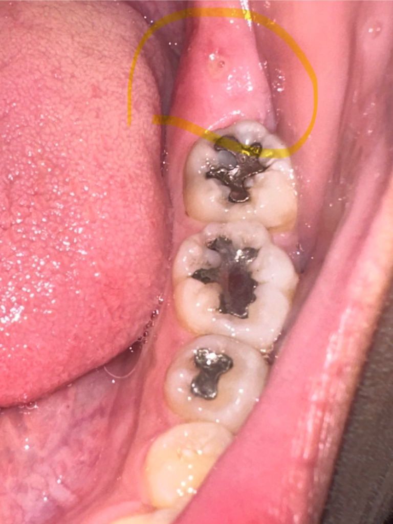 저부위는 아마 잇몸이 치아에 씹혀서 생긴 상처같습니다. 일단은 구내염처럼 소독을 하거나 약을 바르시면 시간이 지나면 괜찮아 지실꺼에요.