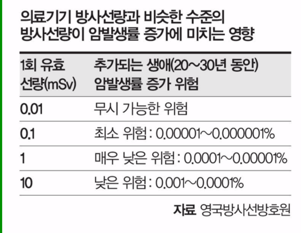 선생님 국제 방사선방호위원회와 양국방사선방호원자료르 캡쳐 올렸는데요 1회 100msv 방사선량이 암발생률0.5증가한다는데 의료기기방사선량 10msv가 0.001프로라면 몇프로라는건가요?