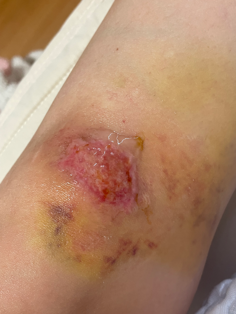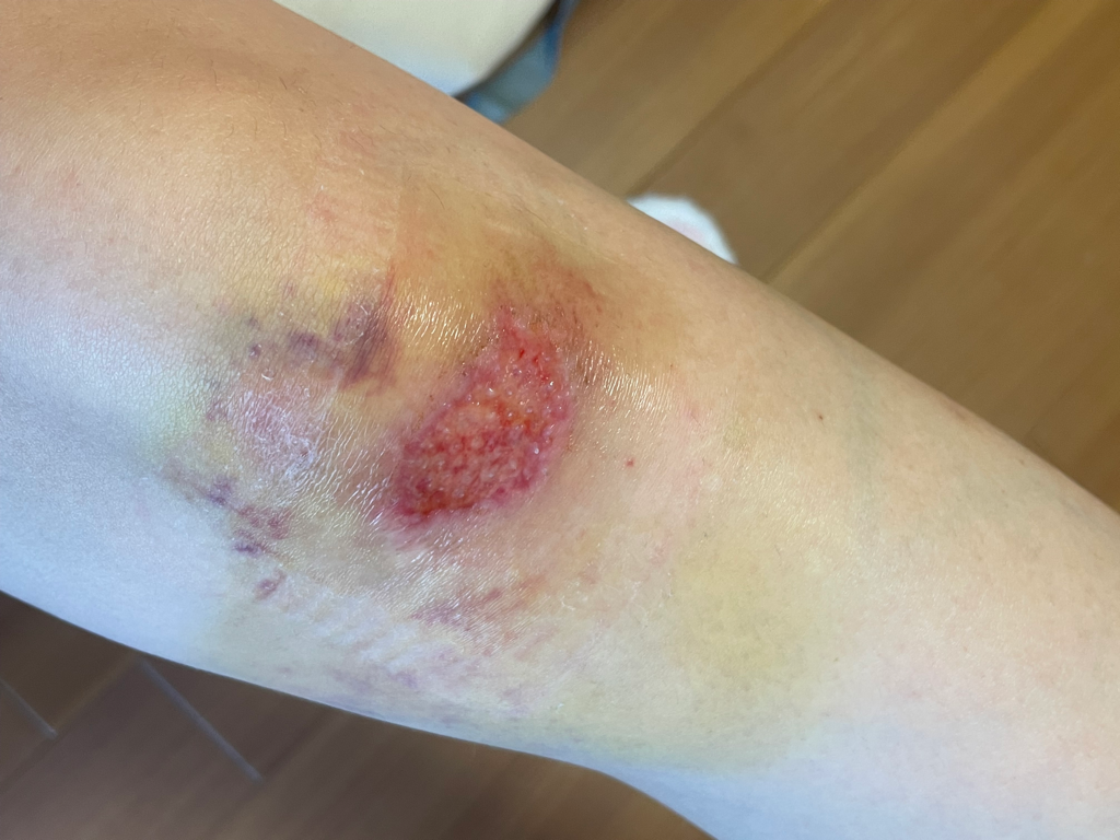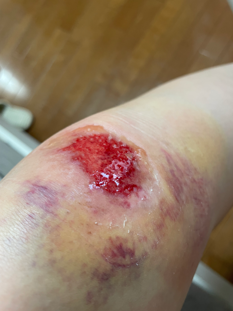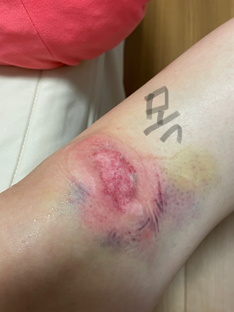 나일론팬츠 긴거 입고 있었는데 옷이 찢어지진 않았는데 쓸리는 바람에 겉 피부가 까진 상태 & 피멍 듦