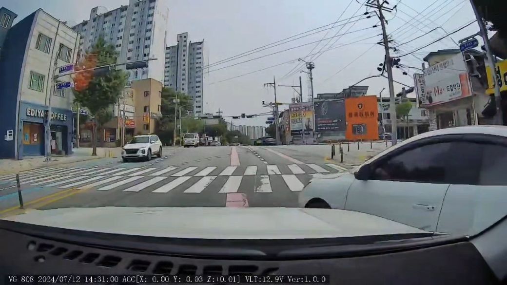 횡단보도 앞 실선차선 구간이고, 유도선 잘 보이고, 신호등은 파란색이고, 깜빡이도 없이 들어왔는데