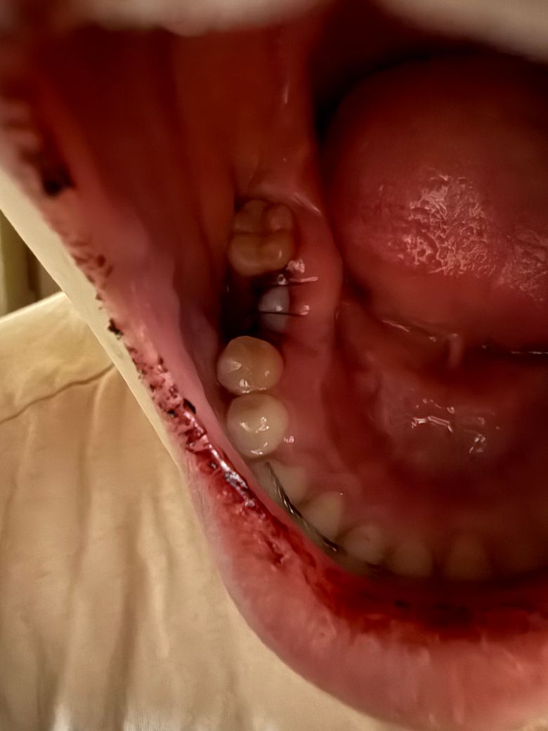 24시. 출혈이 지속적으로 일어났으며 젤리같은 혈액이 수술부위 주변을 다 덮었으며 입안이 피로 범벅이 된 상태에서 취침.